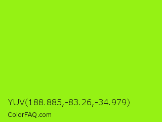 YUV 188.885,-83.26,-34.979 Color is a normal green color and the nearest color is Spring Bud #a7fc00. Hex code #95f214 and RGB value is rgb(149,242,20). In RGB color space, this color is composed of 58% red, 95% green, 8% blue, In CMYK color space, this color is composed of 38% cyan, 0% magenta, 92% yellow , 5% black , In HSL color space, this color has a hue angle of 85° , 90% saturation and 51% lightness.