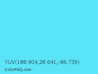 YUV 188.904,28.641,-86.739 Color is a light cyan color and the nearest color is Turquoise Blue #6cdae7. Hex code #5ae4f7 and RGB value is rgb(90,228,247). In RGB color space, this color is composed of 35% red, 89% green, 97% blue, In CMYK color space, this color is composed of 64% cyan, 8% magenta, 0% yellow , 3% black , In HSL color space, this color has a hue angle of 187° , 91% saturation and 66% lightness.