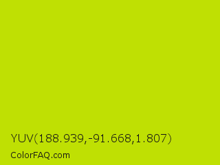 YUV 188.939,-91.668,1.807 Color is a normal yellow color and the nearest color is Fuego #bede0d. Hex code #bfe003 and RGB value is rgb(191,224,3). In RGB color space, this color is composed of 75% red, 88% green, 1% blue, In CMYK color space, this color is composed of 15% cyan, 0% magenta, 99% yellow , 12% black , In HSL color space, this color has a hue angle of 69° , 97% saturation and 45% lightness.