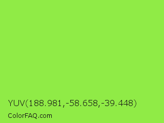 YUV 188.981,-58.658,-39.448 Color is a normal green color and the nearest color is Kiwi #8ee53f. Hex code #90eb46 and RGB value is rgb(144,235,70). In RGB color space, this color is composed of 56% red, 92% green, 27% blue, In CMYK color space, this color is composed of 39% cyan, 0% magenta, 70% yellow , 8% black , In HSL color space, this color has a hue angle of 93° , 80% saturation and 60% lightness.