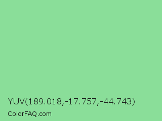 YUV 189.018,-17.757,-44.743 Color is a light green color and the nearest color is Light Green #90ee90. Hex code #8ade99 and RGB value is rgb(138,222,153). In RGB color space, this color is composed of 54% red, 87% green, 60% blue, In CMYK color space, this color is composed of 38% cyan, 0% magenta, 31% yellow , 13% black , In HSL color space, this color has a hue angle of 131° , 56% saturation and 71% lightness.