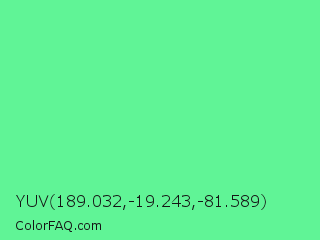 YUV 189.032,-19.243,-81.589 Color is a light green color and the nearest color is Very Light Malachite Green #64e986. Hex code #60f496 and RGB value is rgb(96,244,150). In RGB color space, this color is composed of 38% red, 96% green, 59% blue, In CMYK color space, this color is composed of 61% cyan, 0% magenta, 39% yellow , 4% black , In HSL color space, this color has a hue angle of 142° , 87% saturation and 67% lightness.