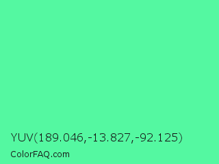 YUV 189.046,-13.827,-92.125 Color is a light green color and the nearest color is Medium Aquamarine #66ddaa. Hex code #54f8a1 and RGB value is rgb(84,248,161). In RGB color space, this color is composed of 33% red, 97% green, 63% blue, In CMYK color space, this color is composed of 66% cyan, 0% magenta, 35% yellow , 3% black , In HSL color space, this color has a hue angle of 148° , 92% saturation and 65% lightness.
