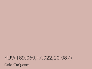 YUV 189.069,-7.922,20.987 Color is a light red color and the nearest color is Clam Shell #d4b6af. Hex code #d5b4ad and RGB value is rgb(213,180,173). In RGB color space, this color is composed of 84% red, 71% green, 68% blue, In CMYK color space, this color is composed of 0% cyan, 15% magenta, 19% yellow , 16% black , In HSL color space, this color has a hue angle of 11° , 32% saturation and 76% lightness.