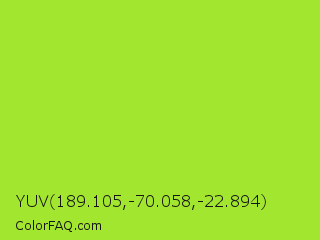 YUV 189.105,-70.058,-22.894 Color is a normal green color and the nearest color is Green Lizard #a7f432. Hex code #a3e62f and RGB value is rgb(163,230,47). In RGB color space, this color is composed of 64% red, 90% green, 18% blue, In CMYK color space, this color is composed of 29% cyan, 0% magenta, 80% yellow , 10% black , In HSL color space, this color has a hue angle of 82° , 79% saturation and 54% lightness.