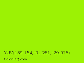 YUV 189.154,-91.281,-29.076 Color is a normal green color and the nearest color is Spring Bud #a7fc00. Hex code #9cf204 and RGB value is rgb(156,242,4). In RGB color space, this color is composed of 61% red, 95% green, 2% blue, In CMYK color space, this color is composed of 36% cyan, 0% magenta, 98% yellow , 5% black , In HSL color space, this color has a hue angle of 82° , 97% saturation and 48% lightness.