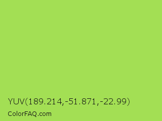 YUV 189.214,-51.871,-22.99 Color is a normal green color and the nearest color is Conifer #acdd4d. Hex code #a3df54 and RGB value is rgb(163,223,84). In RGB color space, this color is composed of 64% red, 87% green, 33% blue, In CMYK color space, this color is composed of 27% cyan, 0% magenta, 62% yellow , 13% black , In HSL color space, this color has a hue angle of 86° , 68% saturation and 60% lightness.