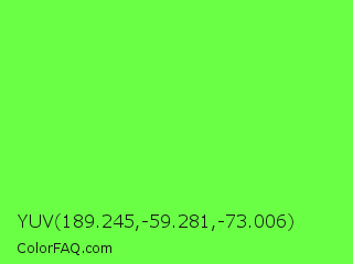 YUV 189.245,-59.281,-73.006 Color is a light green color and the nearest color is Screamin Green #66ff66. Hex code #6aff45 and RGB value is rgb(106,255,69). In RGB color space, this color is composed of 42% red, 100% green, 27% blue, In CMYK color space, this color is composed of 58% cyan, 0% magenta, 73% yellow , 0% black , In HSL color space, this color has a hue angle of 108° , 100% saturation and 64% lightness.