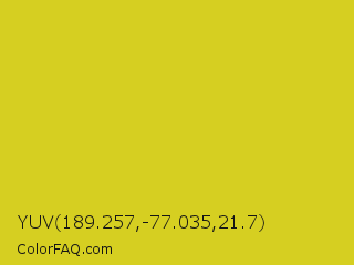 YUV 189.257,-77.035,21.7 Color is a normal yellow color and the nearest color is Bird Flower #d4cd16. Hex code #d6cf21 and RGB value is rgb(214,207,33). In RGB color space, this color is composed of 84% red, 81% green, 13% blue, In CMYK color space, this color is composed of 0% cyan, 3% magenta, 85% yellow , 16% black , In HSL color space, this color has a hue angle of 58° , 73% saturation and 48% lightness.