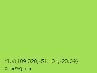 YUV 189.328,-51.434,-23.09 Color is a normal green color and the nearest color is Conifer #acdd4d. Hex code #a3df55 and RGB value is rgb(163,223,85). In RGB color space, this color is composed of 64% red, 87% green, 33% blue, In CMYK color space, this color is composed of 27% cyan, 0% magenta, 62% yellow , 13% black , In HSL color space, this color has a hue angle of 86° , 68% saturation and 60% lightness.