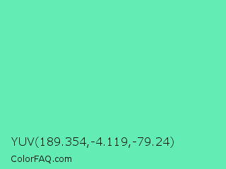 YUV 189.354,-4.119,-79.24 Color is a light green color and the nearest color is Medium Aquamarine #66ddaa. Hex code #63edb5 and RGB value is rgb(99,237,181). In RGB color space, this color is composed of 39% red, 93% green, 71% blue, In CMYK color space, this color is composed of 58% cyan, 0% magenta, 24% yellow , 7% black , In HSL color space, this color has a hue angle of 156° , 79% saturation and 66% lightness.