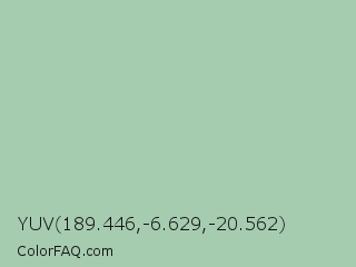 YUV 189.446,-6.629,-20.562 Color is a light green color and the nearest color is Spring Rain #accbb1. Hex code #a6ccb0 and RGB value is rgb(166,204,176). In RGB color space, this color is composed of 65% red, 80% green, 69% blue, In CMYK color space, this color is composed of 19% cyan, 0% magenta, 14% yellow , 20% black , In HSL color space, this color has a hue angle of 136° , 27% saturation and 73% lightness.