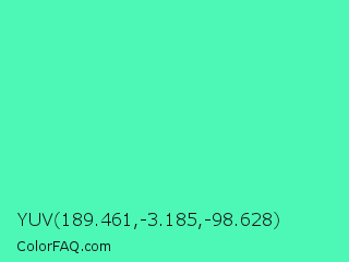 YUV 189.461,-3.185,-98.628 Color is a light green color and the nearest color is Turquoise #40e0d0. Hex code #4df8b7 and RGB value is rgb(77,248,183). In RGB color space, this color is composed of 30% red, 97% green, 72% blue, In CMYK color space, this color is composed of 69% cyan, 0% magenta, 26% yellow , 3% black , In HSL color space, this color has a hue angle of 157° , 92% saturation and 64% lightness.