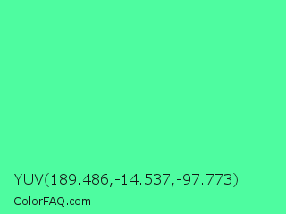 YUV 189.486,-14.537,-97.773 Color is a light green color and the nearest color is Very Light Malachite Green #64e986. Hex code #4efca0 and RGB value is rgb(78,252,160). In RGB color space, this color is composed of 31% red, 99% green, 63% blue, In CMYK color space, this color is composed of 69% cyan, 0% magenta, 37% yellow , 1% black , In HSL color space, this color has a hue angle of 148° , 97% saturation and 65% lightness.