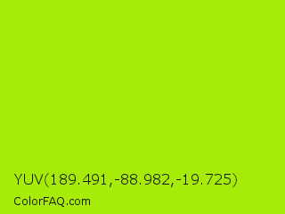 YUV 189.491,-88.982,-19.725 Color is a normal lime color and the nearest color is Inch Worm #b0e313. Hex code #a7ec09 and RGB value is rgb(167,236,9). In RGB color space, this color is composed of 65% red, 93% green, 4% blue, In CMYK color space, this color is composed of 29% cyan, 0% magenta, 96% yellow , 7% black , In HSL color space, this color has a hue angle of 78° , 93% saturation and 48% lightness.