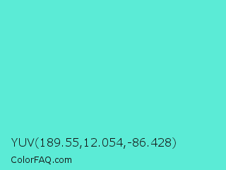 YUV 189.55,12.054,-86.428 Color is a light cyan color and the nearest color is Turquoise Blue #6cdae7. Hex code #5bebd6 and RGB value is rgb(91,235,214). In RGB color space, this color is composed of 36% red, 92% green, 84% blue, In CMYK color space, this color is composed of 61% cyan, 0% magenta, 9% yellow , 8% black , In HSL color space, this color has a hue angle of 171° , 78% saturation and 64% lightness.