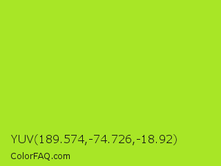 YUV 189.574,-74.726,-18.92 Color is a normal lime color and the nearest color is Green Lizard #a7f432. Hex code #a8e626 and RGB value is rgb(168,230,38). In RGB color space, this color is composed of 66% red, 90% green, 15% blue, In CMYK color space, this color is composed of 27% cyan, 0% magenta, 83% yellow , 10% black , In HSL color space, this color has a hue angle of 79° , 79% saturation and 53% lightness.
