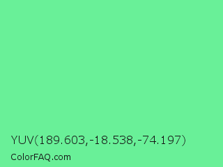 YUV 189.603,-18.538,-74.197 Color is a light green color and the nearest color is Very Light Malachite Green #64e986. Hex code #69f098 and RGB value is rgb(105,240,152). In RGB color space, this color is composed of 41% red, 94% green, 60% blue, In CMYK color space, this color is composed of 56% cyan, 0% magenta, 37% yellow , 6% black , In HSL color space, this color has a hue angle of 141° , 82% saturation and 68% lightness.
