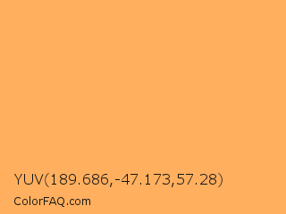 YUV 189.686,-47.173,57.28 Color is a light orange color and the nearest color is Rajah #fbab60. Hex code #ffaf5e and RGB value is rgb(255,175,94). In RGB color space, this color is composed of 100% red, 69% green, 37% blue, In CMYK color space, this color is composed of 0% cyan, 31% magenta, 63% yellow , 0% black , In HSL color space, this color has a hue angle of 30° , 100% saturation and 68% lightness.