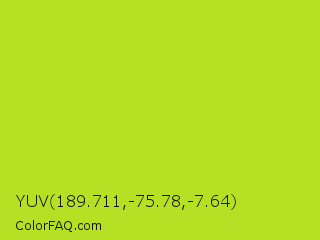 YUV 189.711,-75.78,-7.64 Color is a normal lime color and the nearest color is Inch Worm #b0e313. Hex code #b5e024 and RGB value is rgb(181,224,36). In RGB color space, this color is composed of 71% red, 88% green, 14% blue, In CMYK color space, this color is composed of 19% cyan, 0% magenta, 84% yellow , 12% black , In HSL color space, this color has a hue angle of 74° , 75% saturation and 51% lightness.