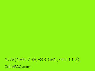 YUV 189.738,-83.681,-40.112 Color is a normal green color and the nearest color is Spring Frost #87ff2a. Hex code #90f614 and RGB value is rgb(144,246,20). In RGB color space, this color is composed of 56% red, 96% green, 8% blue, In CMYK color space, this color is composed of 41% cyan, 0% magenta, 92% yellow , 4% black , In HSL color space, this color has a hue angle of 87° , 93% saturation and 52% lightness.