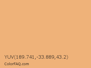 YUV 189.741,-33.889,43.2 Color is a light orange color and the nearest color is Middle Yellow Red #ecb176. Hex code #efb279 and RGB value is rgb(239,178,121). In RGB color space, this color is composed of 94% red, 70% green, 47% blue, In CMYK color space, this color is composed of 0% cyan, 26% magenta, 49% yellow , 6% black , In HSL color space, this color has a hue angle of 29° , 79% saturation and 71% lightness.