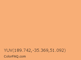 YUV 189.742,-35.369,51.092 Color is a light orange color and the nearest color is Very Light Tangelo #ffb077. Hex code #f8ae76 and RGB value is rgb(248,174,118). In RGB color space, this color is composed of 97% red, 68% green, 46% blue, In CMYK color space, this color is composed of 0% cyan, 30% magenta, 52% yellow , 3% black , In HSL color space, this color has a hue angle of 26° , 90% saturation and 72% lightness.
