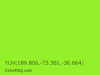 YUV 189.806,-73.361,-36.664 Color is a normal green color and the nearest color is Spring Frost #87ff2a. Hex code #94f029 and RGB value is rgb(148,240,41). In RGB color space, this color is composed of 58% red, 94% green, 16% blue, In CMYK color space, this color is composed of 38% cyan, 0% magenta, 83% yellow , 6% black , In HSL color space, this color has a hue angle of 88° , 87% saturation and 55% lightness.