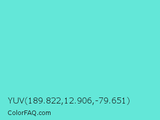 YUV 189.822,12.906,-79.651 Color is a light cyan color and the nearest color is Turquoise Blue #6cdae7. Hex code #63e7d8 and RGB value is rgb(99,231,216). In RGB color space, this color is composed of 39% red, 91% green, 85% blue, In CMYK color space, this color is composed of 57% cyan, 0% magenta, 6% yellow , 9% black , In HSL color space, this color has a hue angle of 173° , 73% saturation and 65% lightness.