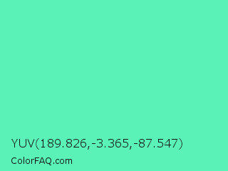 YUV 189.826,-3.365,-87.547 Color is a light green color and the nearest color is Medium Aquamarine #66ddaa. Hex code #5af2b7 and RGB value is rgb(90,242,183). In RGB color space, this color is composed of 35% red, 95% green, 72% blue, In CMYK color space, this color is composed of 63% cyan, 0% magenta, 24% yellow , 5% black , In HSL color space, this color has a hue angle of 157° , 85% saturation and 65% lightness.