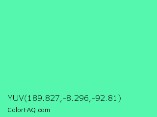 YUV 189.827,-8.296,-92.81 Color is a light green color and the nearest color is Medium Aquamarine #66ddaa. Hex code #54f7ad and RGB value is rgb(84,247,173). In RGB color space, this color is composed of 33% red, 97% green, 68% blue, In CMYK color space, this color is composed of 66% cyan, 0% magenta, 30% yellow , 3% black , In HSL color space, this color has a hue angle of 153° , 91% saturation and 65% lightness.