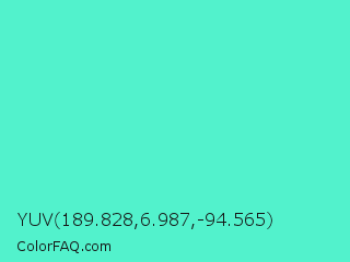 YUV 189.828,6.987,-94.565 Color is a light cyan color and the nearest color is Turquoise #40e0d0. Hex code #52f2cc and RGB value is rgb(82,242,204). In RGB color space, this color is composed of 32% red, 95% green, 80% blue, In CMYK color space, this color is composed of 66% cyan, 0% magenta, 16% yellow , 5% black , In HSL color space, this color has a hue angle of 166° , 86% saturation and 64% lightness.