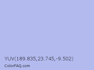 YUV 189.835,23.745,-9.502 Color is a very light blue color and the nearest color is Perano #a9bef2. Hex code #b3baee and RGB value is rgb(179,186,238). In RGB color space, this color is composed of 70% red, 73% green, 93% blue, In CMYK color space, this color is composed of 25% cyan, 22% magenta, 0% yellow , 7% black , In HSL color space, this color has a hue angle of 233° , 63% saturation and 82% lightness.