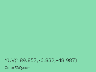 YUV 189.857,-6.832,-48.987 Color is a light green color and the nearest color is Vista Blue #8fd6b4. Hex code #86ddb0 and RGB value is rgb(134,221,176). In RGB color space, this color is composed of 53% red, 87% green, 69% blue, In CMYK color space, this color is composed of 39% cyan, 0% magenta, 20% yellow , 13% black , In HSL color space, this color has a hue angle of 149° , 56% saturation and 70% lightness.