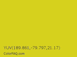 YUV 189.861,-79.797,21.17 Color is a normal yellow color and the nearest color is Bird Flower #d4cd16. Hex code #d6d11c and RGB value is rgb(214,209,28). In RGB color space, this color is composed of 84% red, 82% green, 11% blue, In CMYK color space, this color is composed of 0% cyan, 2% magenta, 87% yellow , 16% black , In HSL color space, this color has a hue angle of 58° , 77% saturation and 47% lightness.
