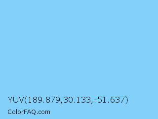 YUV 189.879,30.133,-51.637 Color is a light blue color and the nearest color is Light Sky Blue #87cefa. Hex code #83d0fb and RGB value is rgb(131,208,251). In RGB color space, this color is composed of 51% red, 82% green, 98% blue, In CMYK color space, this color is composed of 48% cyan, 17% magenta, 0% yellow , 2% black , In HSL color space, this color has a hue angle of 202° , 94% saturation and 75% lightness.