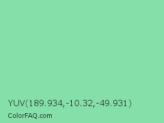 YUV 189.934,-10.32,-49.931 Color is a light green color and the nearest color is Vista Blue #8fd6b4. Hex code #85dfa9 and RGB value is rgb(133,223,169). In RGB color space, this color is composed of 52% red, 87% green, 66% blue, In CMYK color space, this color is composed of 40% cyan, 0% magenta, 24% yellow , 13% black , In HSL color space, this color has a hue angle of 144° , 58% saturation and 70% lightness.