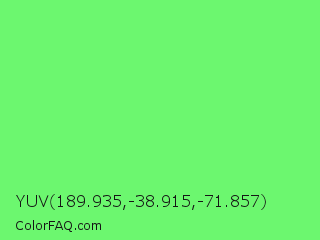 YUV 189.935,-38.915,-71.857 Color is a light green color and the nearest color is Screamin Green #66ff66. Hex code #6cf76f and RGB value is rgb(108,247,111). In RGB color space, this color is composed of 42% red, 97% green, 44% blue, In CMYK color space, this color is composed of 56% cyan, 0% magenta, 55% yellow , 3% black , In HSL color space, this color has a hue angle of 121° , 90% saturation and 70% lightness.