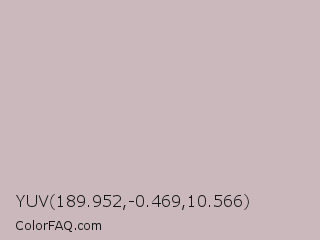 YUV 189.952,-0.469,10.566 Color is a light rose color and the nearest color is Cold Turkey #cebaba. Hex code #cab8bd and RGB value is rgb(202,184,189). In RGB color space, this color is composed of 79% red, 72% green, 74% blue, In CMYK color space, this color is composed of 0% cyan, 9% magenta, 6% yellow , 21% black , In HSL color space, this color has a hue angle of 343° , 15% saturation and 76% lightness.