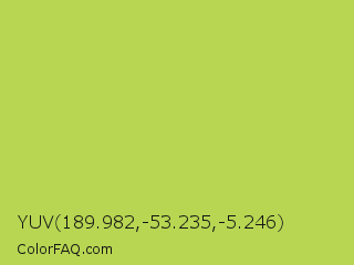 YUV 189.982,-53.235,-5.246 Color is a normal lime color and the nearest color is June Bud #bdda57. Hex code #b8d652 and RGB value is rgb(184,214,82). In RGB color space, this color is composed of 72% red, 84% green, 32% blue, In CMYK color space, this color is composed of 14% cyan, 0% magenta, 62% yellow , 16% black , In HSL color space, this color has a hue angle of 74° , 62% saturation and 58% lightness.