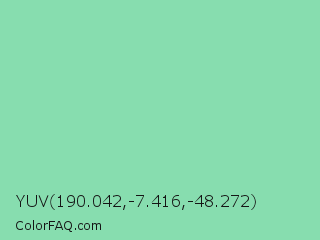 YUV 190.042,-7.416,-48.272 Color is a light green color and the nearest color is Vista Blue #8fd6b4. Hex code #87ddaf and RGB value is rgb(135,221,175). In RGB color space, this color is composed of 53% red, 87% green, 69% blue, In CMYK color space, this color is composed of 39% cyan, 0% magenta, 21% yellow , 13% black , In HSL color space, this color has a hue angle of 148° , 56% saturation and 70% lightness.
