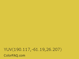 YUV 190.117,-61.19,26.207 Color is a normal yellow color and the nearest color is Wattle #dcd747. Hex code #dcc742 and RGB value is rgb(220,199,66). In RGB color space, this color is composed of 86% red, 78% green, 26% blue, In CMYK color space, this color is composed of 0% cyan, 10% magenta, 70% yellow , 14% black , In HSL color space, this color has a hue angle of 52° , 69% saturation and 56% lightness.
