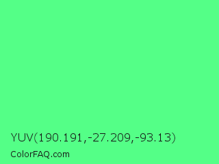 YUV 190.191,-27.209,-93.13 Color is a light green color and the nearest color is Very Light Malachite Green #64e986. Hex code #54ff87 and RGB value is rgb(84,255,135). In RGB color space, this color is composed of 33% red, 100% green, 53% blue, In CMYK color space, this color is composed of 67% cyan, 0% magenta, 47% yellow , 0% black , In HSL color space, this color has a hue angle of 138° , 100% saturation and 66% lightness.