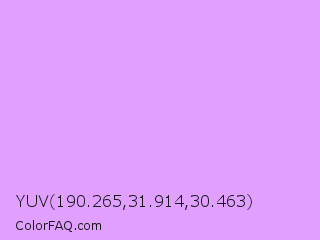 YUV 190.265,31.914,30.463 Color is a very light purple color and the nearest color is Mauve #e0b0ff. Hex code #e1a0ff and RGB value is rgb(225,160,255). In RGB color space, this color is composed of 88% red, 63% green, 100% blue, In CMYK color space, this color is composed of 12% cyan, 37% magenta, 0% yellow , 0% black , In HSL color space, this color has a hue angle of 281° , 100% saturation and 81% lightness.