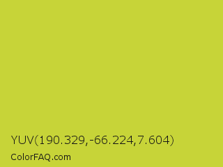 YUV 190.329,-66.224,7.604 Color is a normal yellow color and the nearest color is Pear #d1e231. Hex code #c7d438 and RGB value is rgb(199,212,56). In RGB color space, this color is composed of 78% red, 83% green, 22% blue, In CMYK color space, this color is composed of 6% cyan, 0% magenta, 74% yellow , 17% black , In HSL color space, this color has a hue angle of 65° , 64% saturation and 53% lightness.