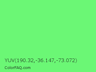 YUV 190.32,-36.147,-73.072 Color is a light green color and the nearest color is Screamin Green #66ff66. Hex code #6bf775 and RGB value is rgb(107,247,117). In RGB color space, this color is composed of 42% red, 97% green, 46% blue, In CMYK color space, this color is composed of 57% cyan, 0% magenta, 53% yellow , 3% black , In HSL color space, this color has a hue angle of 124° , 90% saturation and 69% lightness.