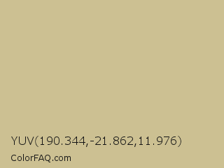 YUV 190.344,-21.862,11.976 Color is a light yellow color and the nearest color is Yuma #cec291. Hex code #ccc092 and RGB value is rgb(204,192,146). In RGB color space, this color is composed of 80% red, 75% green, 57% blue, In CMYK color space, this color is composed of 0% cyan, 6% magenta, 28% yellow , 20% black , In HSL color space, this color has a hue angle of 48° , 36% saturation and 69% lightness.