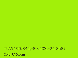 YUV 190.344,-89.403,-24.858 Color is a normal green color and the nearest color is Spring Bud #a7fc00. Hex code #a2f009 and RGB value is rgb(162,240,9). In RGB color space, this color is composed of 64% red, 94% green, 4% blue, In CMYK color space, this color is composed of 33% cyan, 0% magenta, 96% yellow , 6% black , In HSL color space, this color has a hue angle of 80° , 93% saturation and 49% lightness.