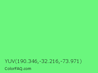 YUV 190.346,-32.216,-73.971 Color is a light green color and the nearest color is Very Light Malachite Green #64e986. Hex code #6af67d and RGB value is rgb(106,246,125). In RGB color space, this color is composed of 42% red, 96% green, 49% blue, In CMYK color space, this color is composed of 57% cyan, 0% magenta, 49% yellow , 4% black , In HSL color space, this color has a hue angle of 128° , 89% saturation and 69% lightness.