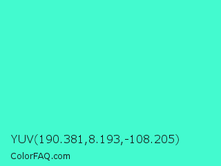 YUV 190.381,8.193,-108.205 Color is a light cyan color and the nearest color is Turquoise #40e0d0. Hex code #43facf and RGB value is rgb(67,250,207). In RGB color space, this color is composed of 26% red, 98% green, 81% blue, In CMYK color space, this color is composed of 73% cyan, 0% magenta, 17% yellow , 2% black , In HSL color space, this color has a hue angle of 166° , 95% saturation and 62% lightness.